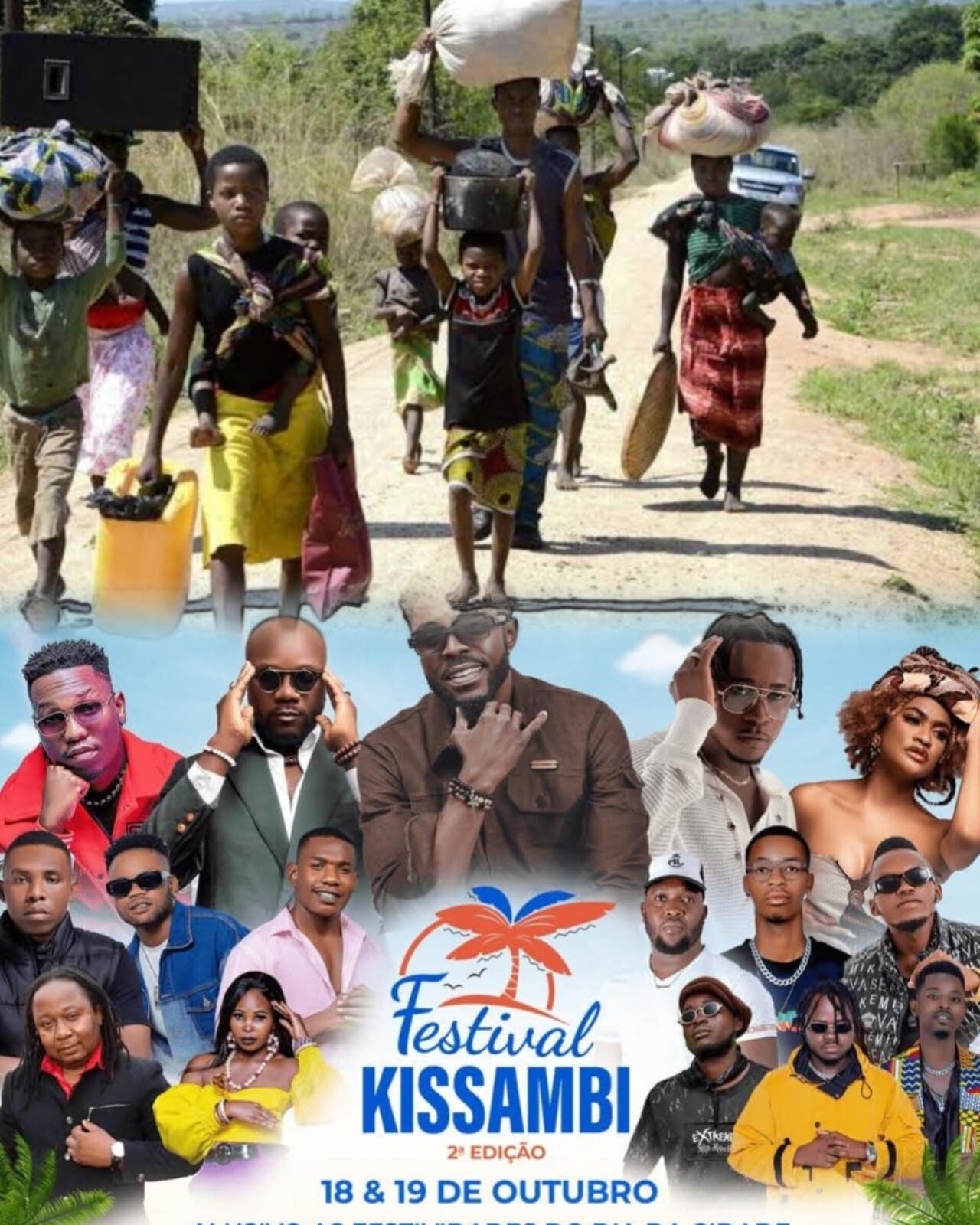 “As crianças pedem comida e recebem promessas” diz Maria Timóteo, deslocada e mãe de quatro filhos. “Pemba dança e canta, e nós rezamos para não passarmos mais uma noite sem jantar. A festa não nos alimenta.”